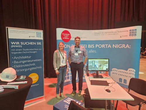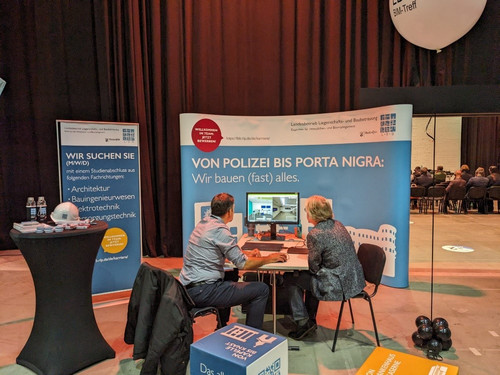Am 20. Mai nahm der Landesbetrieb LBB an der Firmenkontaktmesse Treffpunkt an der RPTU Kaiserslautern teil. Im Foyer des Gebäudes 42 konnten sich die Studierenden über Einstiegsmöglichkeiten beim Landesbetrieb LBB informieren. Insgesamt war die Messe sehr gut besucht. Am LBB-Messestand konnten um die 70 Besucher*innen gezählt werden. Besonders gefragt waren Werksstudierendentätigkeiten, konkrete Jobangebote und die Möglichkeit des Einstiegs in die Beamtenlaufbahn durch das Technische Referendariat. Insgesamt 29 ausführliche Gespräche wurden am Stand geführt und somit konnte unser Messeteam am Ende des Tages ein durchweg positives Resümee ziehen.